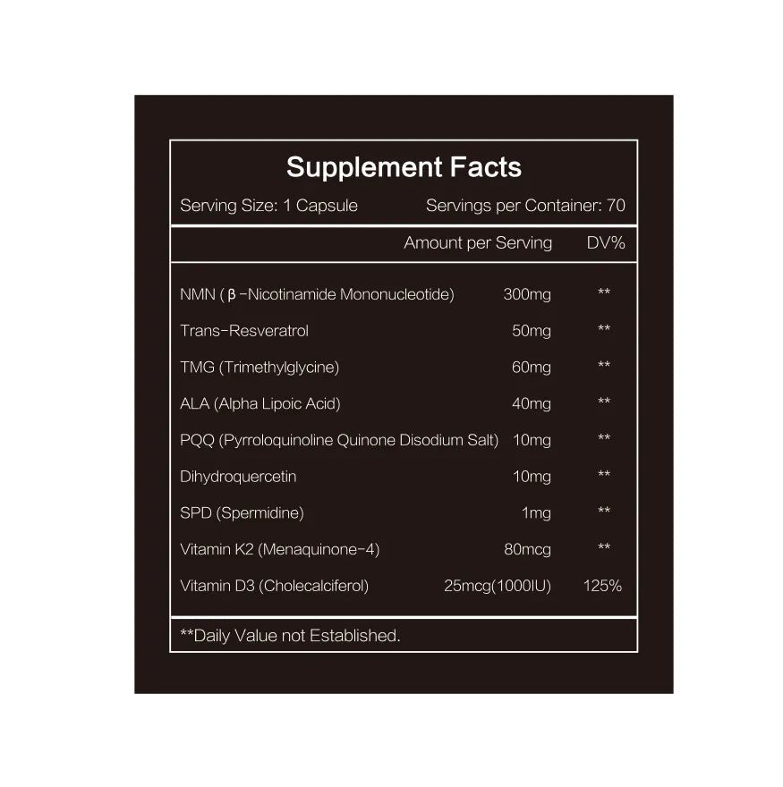 Essentially, the combination of NMN and resveratrol provides a comprehensive anti-aging approach by supporting cellular health, DNA repair, and mitochondrial function, ultimately helping to maintain youth and longevity.