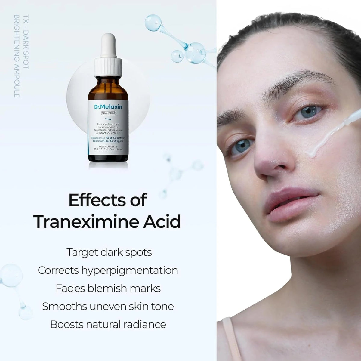Dr. Melaxin TX AmpoulesContains tranexamic acid, which helps prevent the formation of melanin—the main cause of age spots—and gives you an even and healthy skin tone.