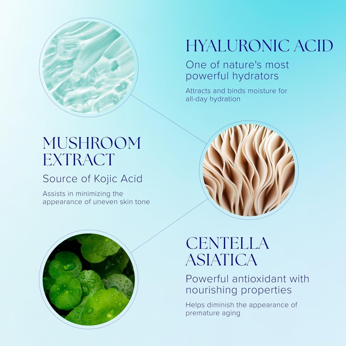 抗氧化保護**:含積雪草(Centella Asiatica)和蘑菇萃取(Polyporus Umbellatus Extract),提供強效抗氧化保護,幫助減少自由基損害,減緩肌膚老化跡象。