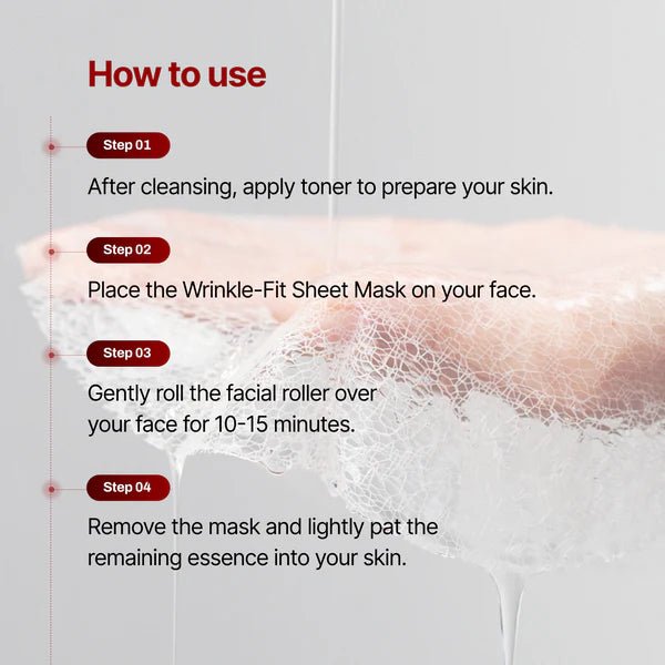 每星期2-3次, 建議與Wrinkle-Fit按摩滾輪一起使用,以達到最佳效果。將面膜片塗抹在皮膚上,從臉部內側向外側輕輕滾動,每個區域5-10 次。