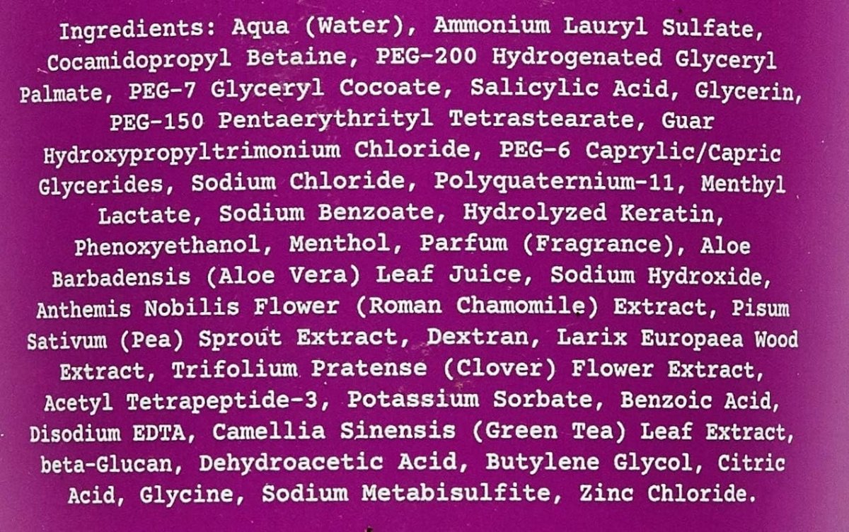 Aqua (Water), Ammonium Lauryl Sulfate, Cocamidopropyl Betaine, PEG-200 Hydrogenated Glyceryl Palmate, PEG-7 Glyceryl Cocoate, Salicylic Acid, Glycerin, PEG-150 Pentaerythrityl Tetrastearate, Guar Hydroxypropyltrimonium Chloride, PEG-6 Caprylic/Capric Glycerides, Polyquaternium-11, Menthyl Lactate, Sodium Benzoate, Hydrolyzed Keratin, Phenoxyethanol, Menthol, Parfum (Fragrance), Aloe Barbadensis (Aloe Vera) Leaf Juice, Sodium Hydroxide, Anthemis Nobilis Flower Extract, Pisum Sativum (Pea) Sprout Extract, Dextran, Larix Europaea (Larch) Wood Extract, Trifolium Pratense (Clover) Flower Extract, Acetyl Tetrapeptide-3, Potassium Sorbate, Benzoic Acid, Disodium EDTA, Camellia Sinensis Leaf (Green Tea) Extract, Beta-Glucan, Dehydroacetic Acid, Butylene Glycol, Citric Acid, Glycine, Sodium Metabisulfite, Zinc Chloride, 1,2-Hexanediol, Caprylyl Glycol.