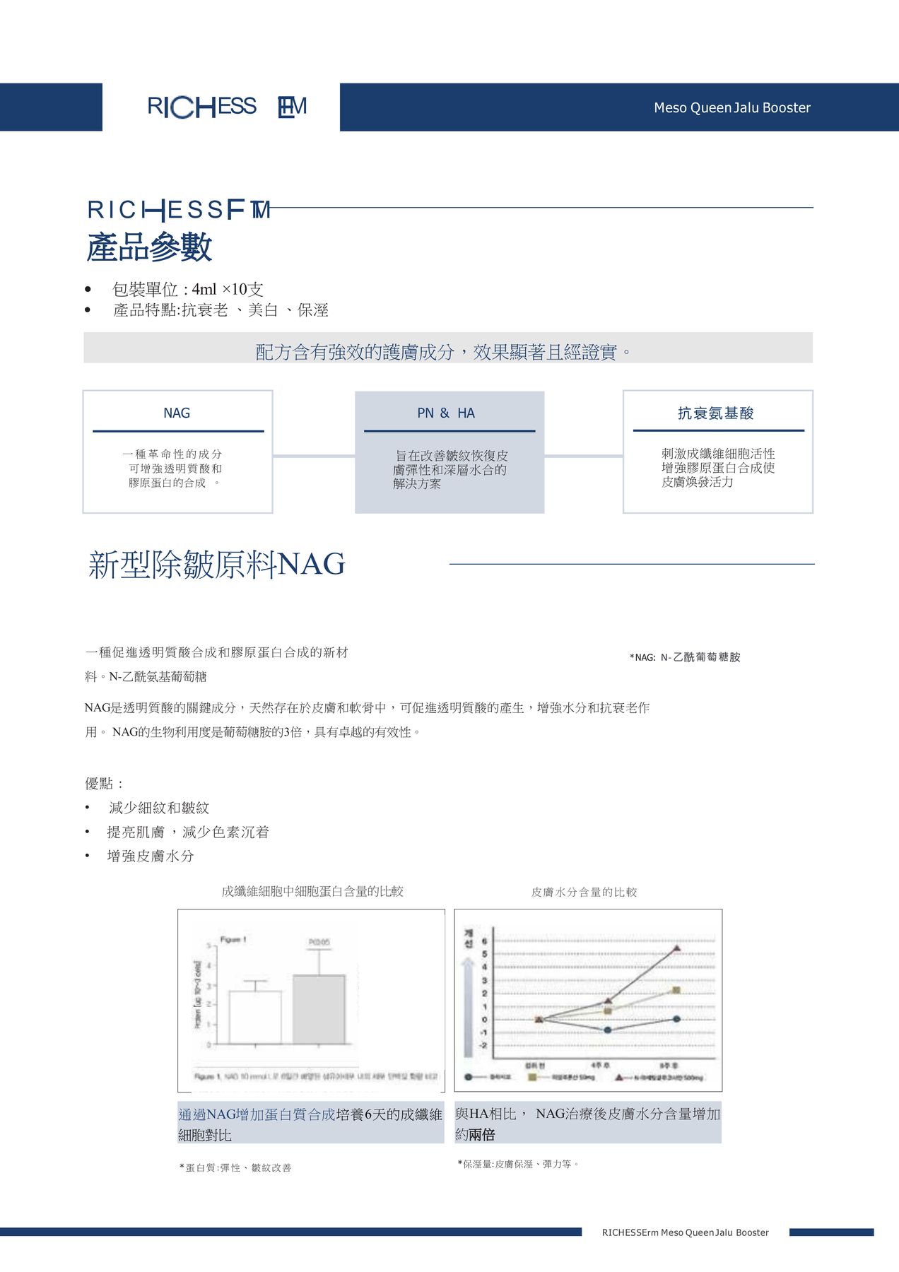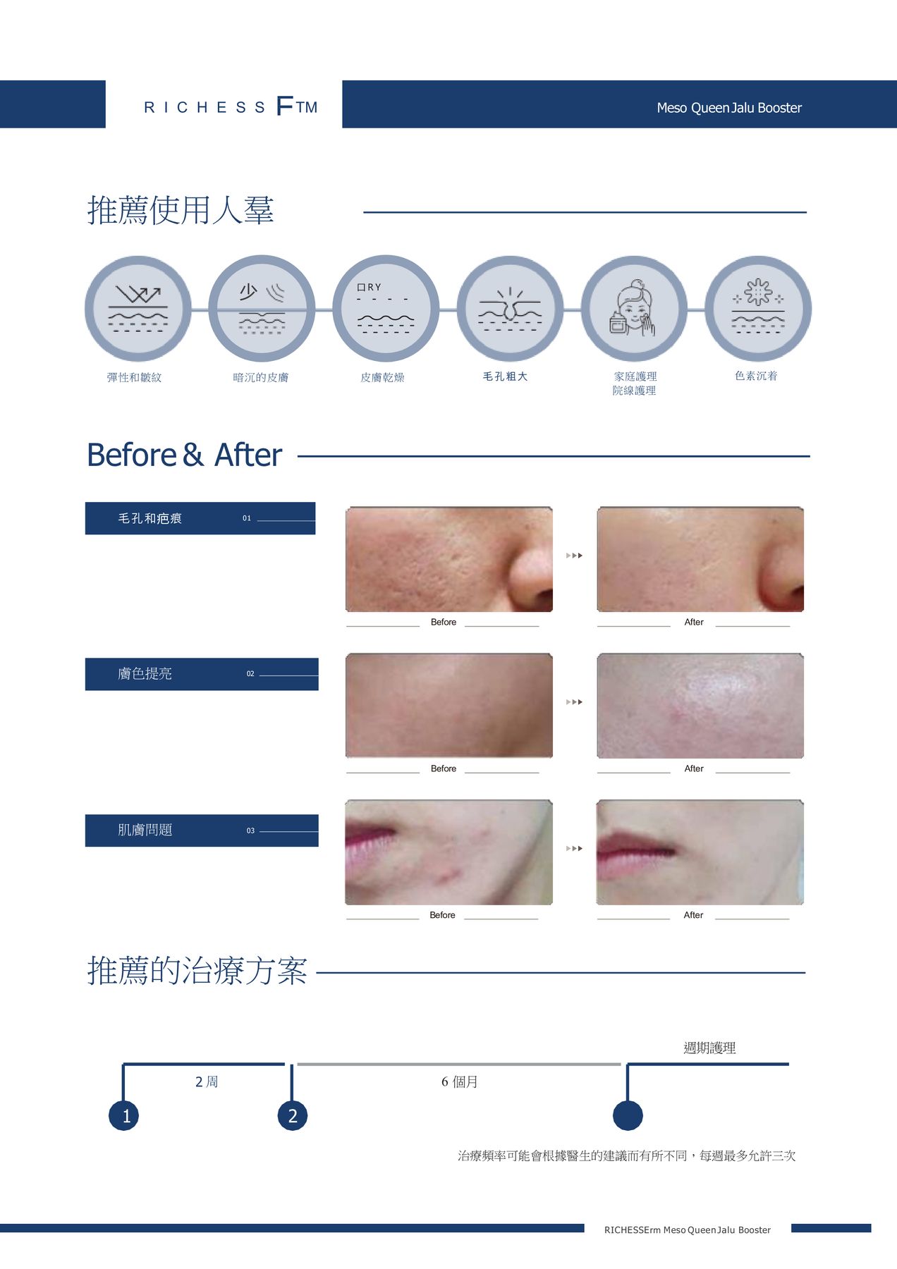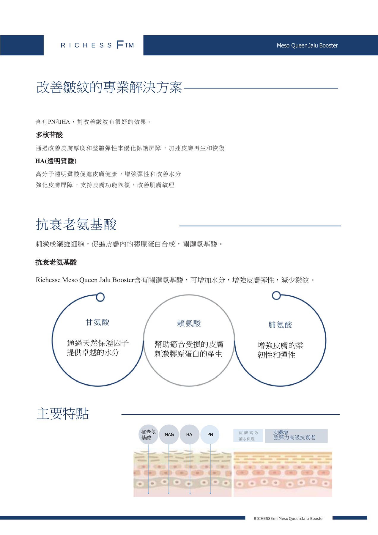 從淡化細紋和色素沉著,到提升肌膚彈性和水分,Richesse Meso Queen Jalu Booster為成熟、暗沉或缺水肌膚提供全方位解決方案。它適用於臨床護理或高級護膚流程,每次使用都能幫助肌膚展現更光滑、更明亮、更年輕的狀態。