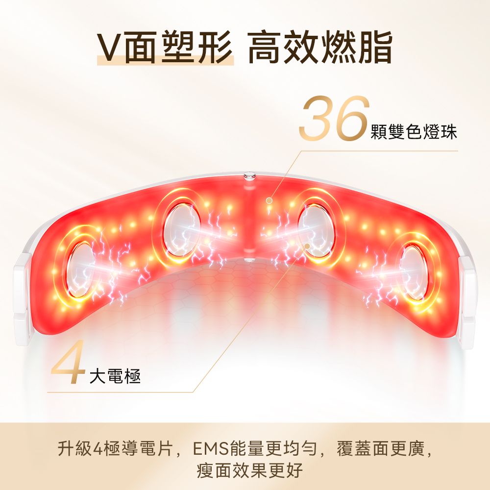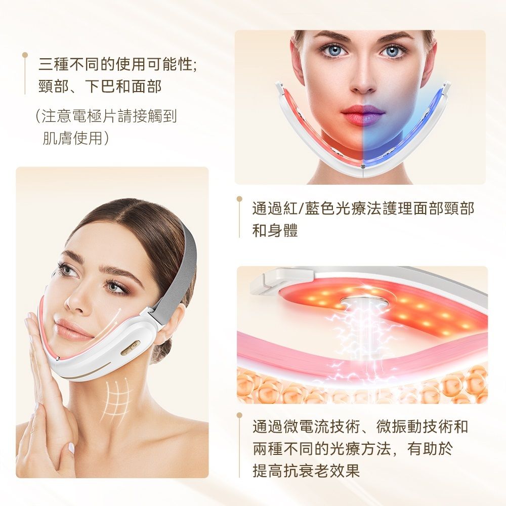- ⚡ EMS 微電流技術 (4極覆蓋): 升級版擁有 4 個大型電極導電片,覆蓋面積倍增!精準模擬面部肌肉收縮運動,喚醒衰老細胞,恢復肌肉彈性,從肌底真正收緊下顎線。