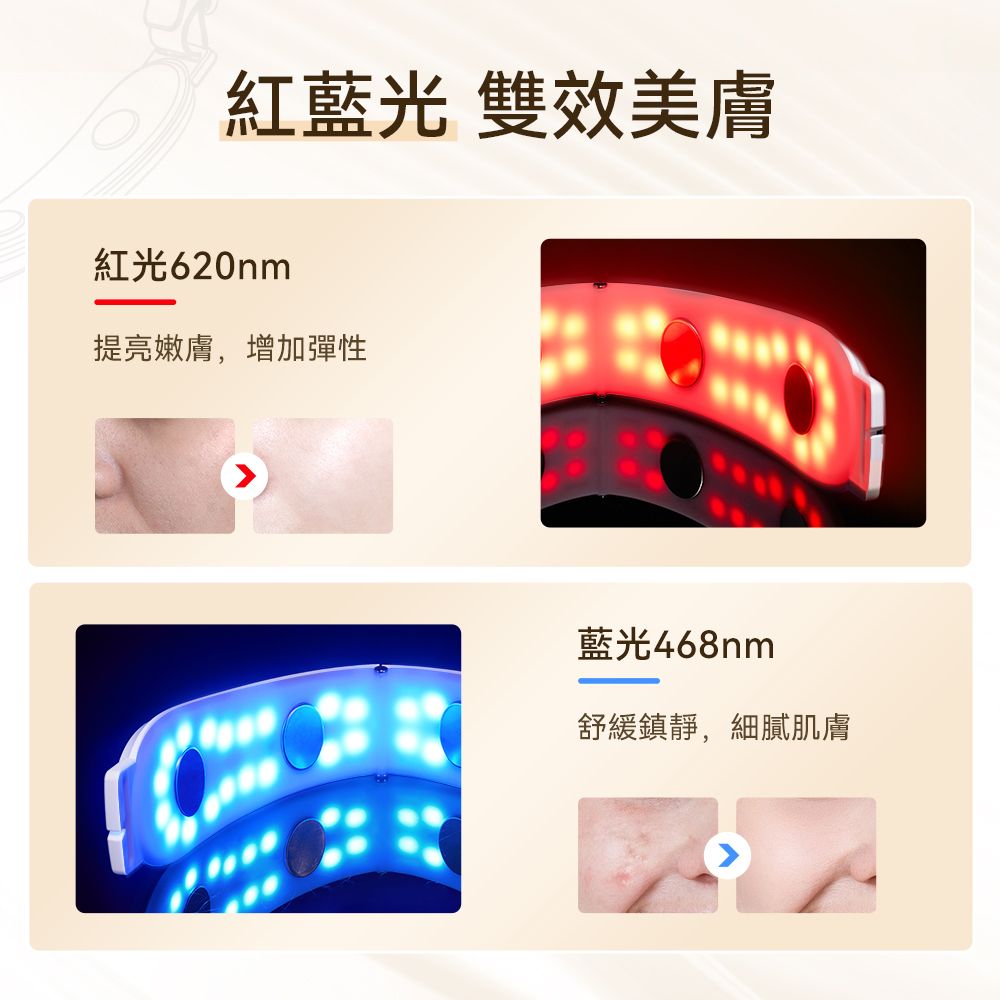 - 🔴 紅光 (620-625nm): 啟動膠原蛋白自生,提亮膚色,嫩化初老肌。