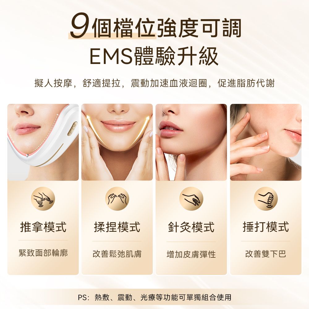 無論是水腫還是肌肉型大面,都能對症下藥!搭配 9 檔力度調節,敏感肌也能找到最舒適的提拉感: