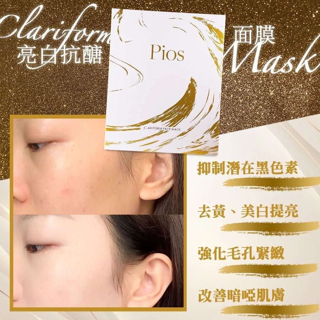 Pios Clariform面膜選用最優質護膚成份,能夠迅速增強維生素,使你肌膚顯得亮白透滑,改善暗啞肌膚。維生素C有效減少黑色素及阻檔色斑形成,並促進再生膠原蛋白。煙酰胺有效抑制潛在黑色素並增加抗糖基化特性,幫助強化毛孔緊緻,為肌膚產生天然屏障。而天然花卉提取物具有抗氧化作用為肌膚打好基礎保護,使肌膚持續水潤彈滑,更顯年輕。